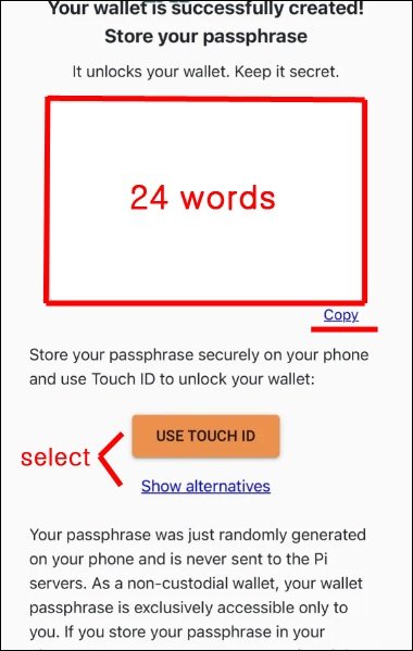 Contrast your phone screen with the part I marked with the red box in the image above. There will be 24 English words written on it. This is the "mnemonic" word for the Pi wallet you will use in the future. In other words, it is called a Passphrase, which is the password for your Pi Wallet.